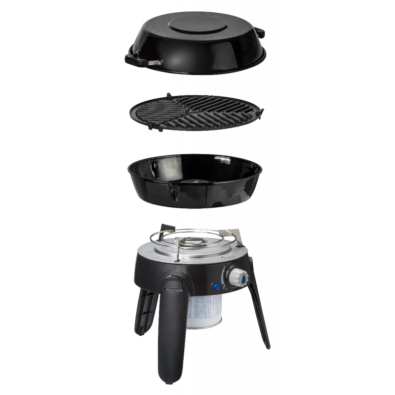 This compact, versatile gas barbecue weighs less than 4 kg and comes with at least three different cooking surfaces; a burner with potstand, a BBQ grid and a lid/dome ( the lid/dome can also be used as a pot).