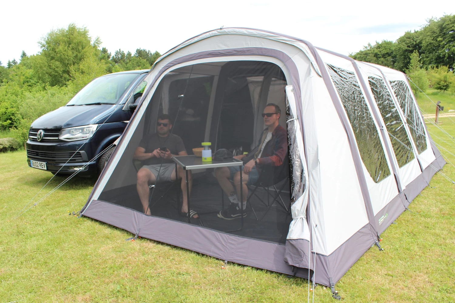 The Movelite PC Porch Door is a fantastic addition to the Movelite T4E PC. Constructed from the same exquisite breathable polycotton fabric as the awning, and connected using a robust zip, it fits snugly around the front tube of the integral awning canopy creating a weatherproof seal using a tight-fitting gusset. There is a large zip back door which allows for full or half opening complete with large windows with zip-up curtains, behind this is a full mesh panel which can be left in to offer maximum airflow through the awning while keeping insects out. Complete with PE groundsheet this porch door creates a practical sheltered and private space, and combined with the full roll-back internal door of the awning can be used to significantly extend the internal living space to suit personal requirements.