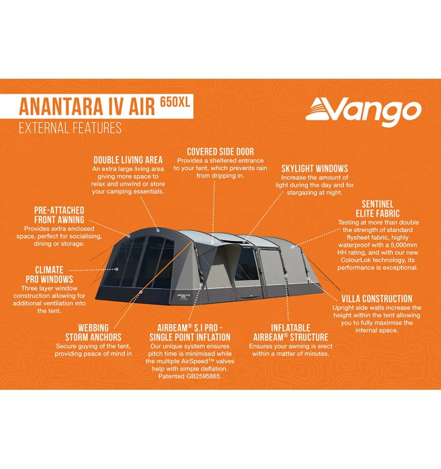 The Vango Anantara IV Air 650XL is a 6-man inflatable tent features the award-winning AirBeam S.I Pro® Single Point Inflation System for easy pitching and a pre-attached front awning for a separate living area. Its Tinted Diamond Pro windows, Midnight Bedroom technology, SkyLight Windows and Villa Construction offer enhanced privacy, insulation and brightness. The 5,000mmHH waterproof Sentinel Elite Fabric and ColourLok™ technology provide exceptional performance and climate control. Optional zip on Studios extend your space and make it an ideal tent for family camping holidays.