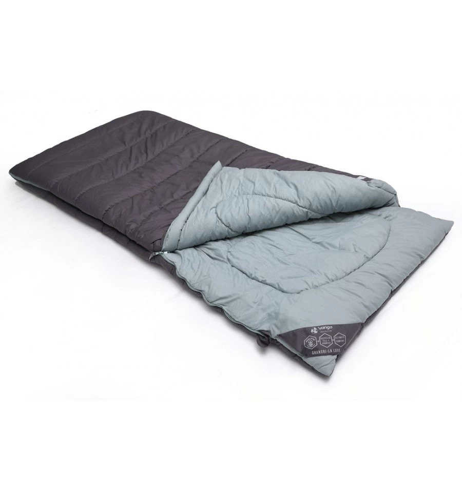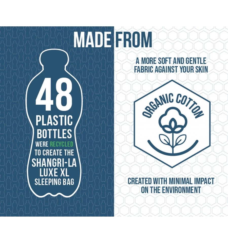 The Vango Shangri-La Collection has expanded into this beautiful new range of luxury sleeping bags to complement our award-winning Shangri-la mats for the ultimate nightβs sleep. As part of our Earth Collection, this Shangri-La Luxe XL bag is longer and wider than standard singles and has been made using organic cotton and 100% recycled polyester, making it a more sustainable choice. This square shaped, XL sleeping bag with integrated headrest provides the extra space and comfort you need for the perfect sleep and the brushed organic cotton is hypo-allergenic and feels soft on your skin, much like your cosy winter bedding at home, soft, comfortable and warm to touch on a cold night. Machine washable at 30 degrees and comes in a compression carry bag for a smaller pack size and for easy storage. Sleep like royalty on your camping or campervan trips and use for everyday use when you have family of friends over to stay.